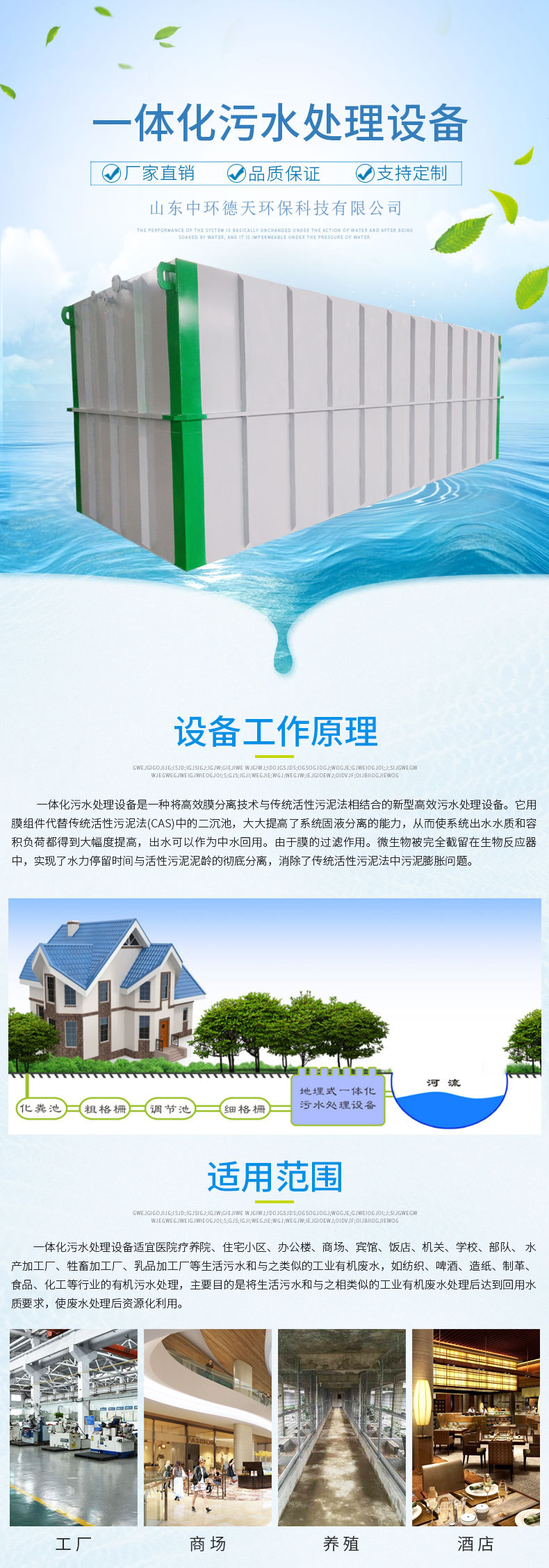 MBR一體化污水處理設(shè)備是一種將膜分離技術(shù)與傳統(tǒng)活性污泥法相結(jié)合的新型污水處理設(shè)備。它用膜組件代替?zhèn)鹘y(tǒng)活性污泥法(CAS)中的二沉池,大大提高了系統(tǒng)固液分離的能力,從而使系統(tǒng)出水水質(zhì)和容積負(fù)荷都得到大幅度提高,出水可以作為中水回用。由于膜的過濾作用。微生物被完全截留在生物反應(yīng)器中,實現(xiàn)了水力停留時間與活性污泥泥齡的分離,消除了傳統(tǒng)活性污泥法中污泥膨脹問題。出水能穩(wěn)定達(dá)到或優(yōu)于《城市污水再生利用·城市雜用水水質(zhì)》GB/T18920—2002標(biāo)準(zhǔn)。
